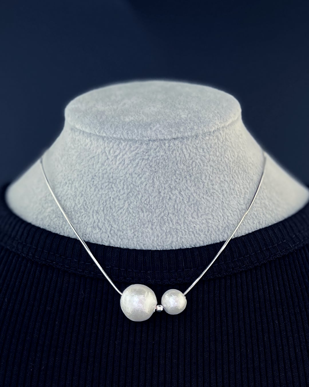 12 mmと8 mmのコットンパール、その中心にSilver925ビーズをセットし、艶やかな0.7 mmスネークチェーンに通しました。フォーマルすぎない軽やかな質感と、シンプルなのに視線を奪うバランス感で、コーディネートの“抜け”にも“締め”にも活躍。