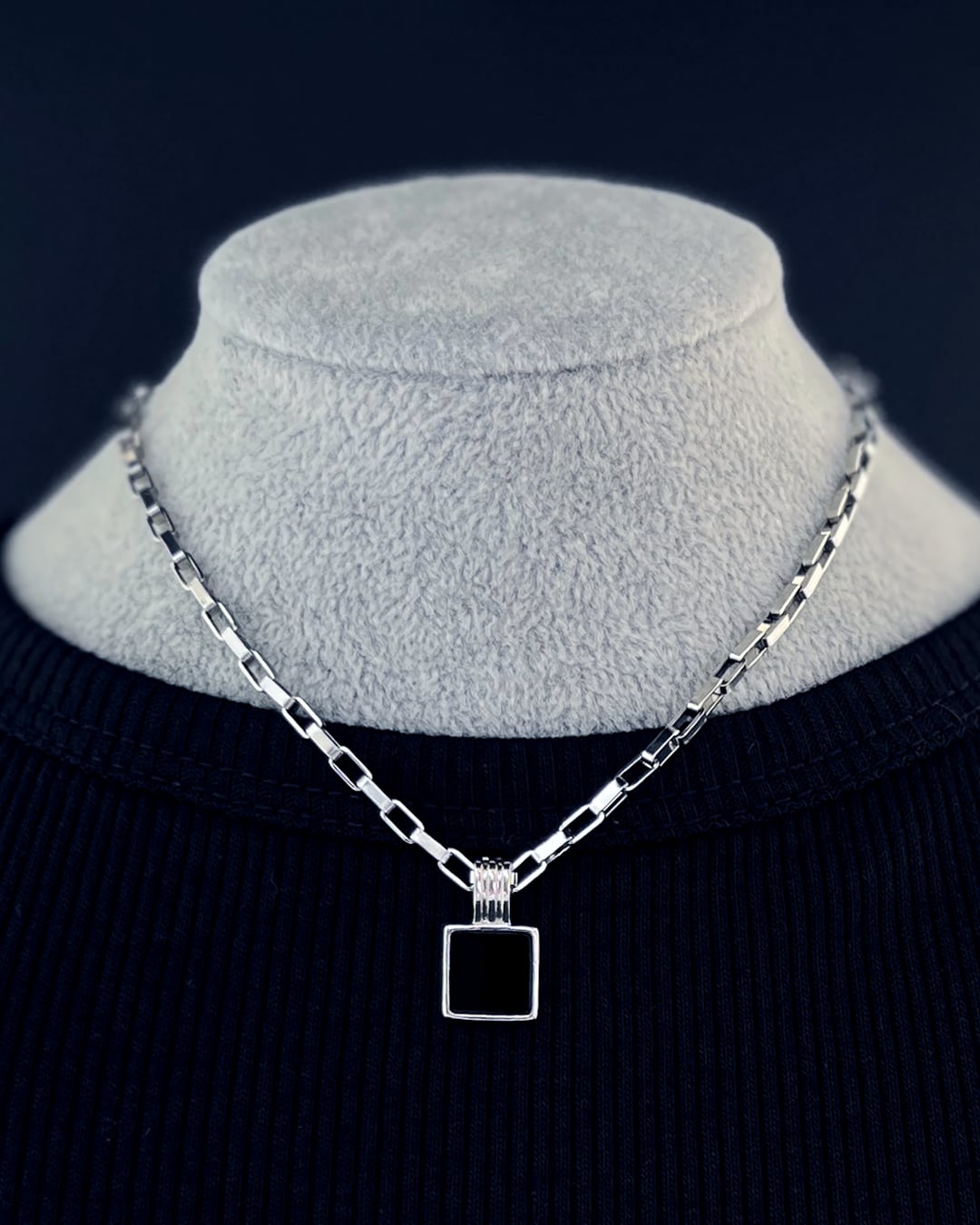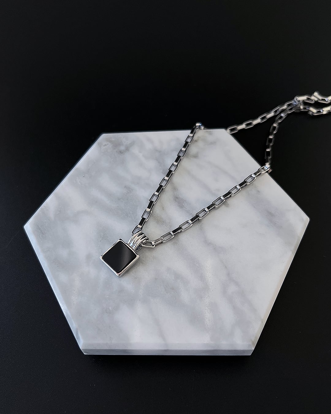 程よいボリュームのステンレスチェーンに、艶めくブラックオニキスをスクエアフレームでセット。